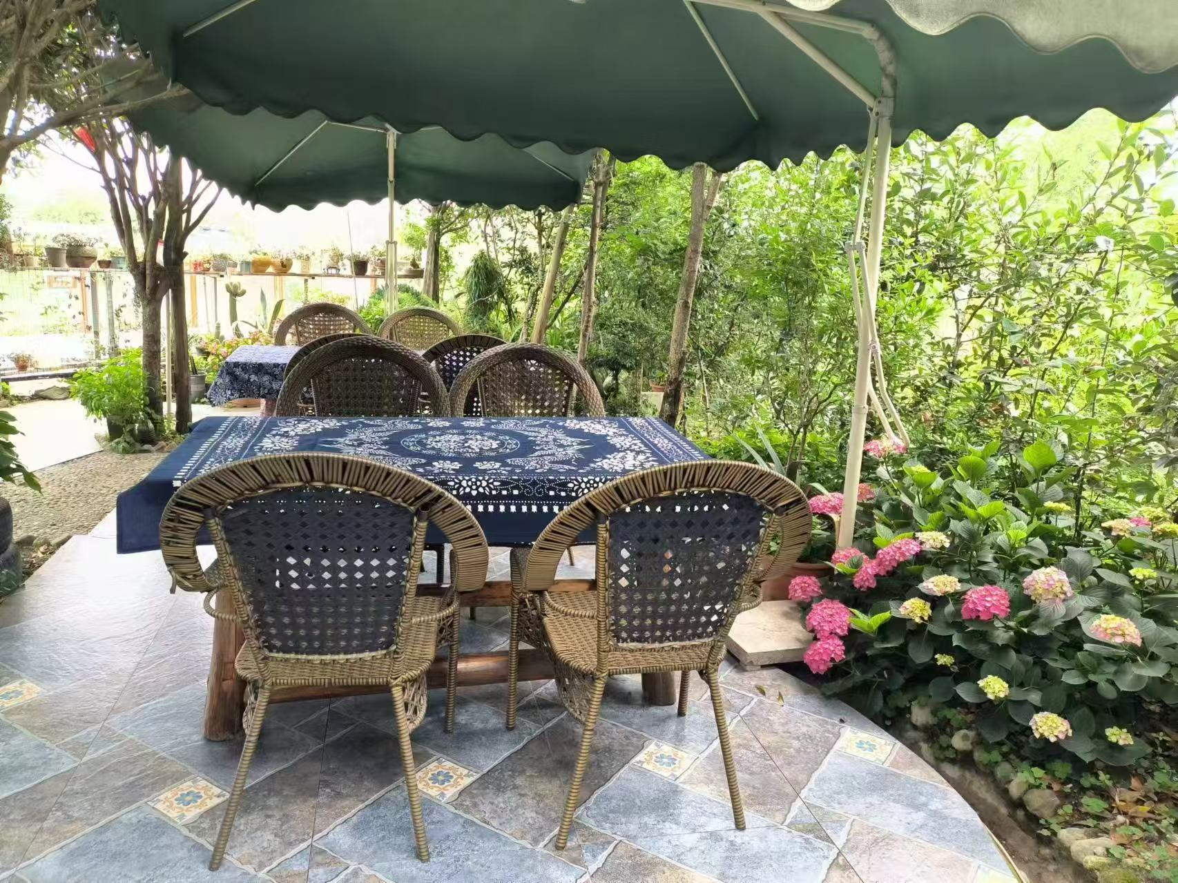 踏入小院,绚烂的绣球花瞬间抓住眼球。粉紫蓝各色花朵簇拥着,在风中摇曳,散发悠悠甜香。除了绣球还有木香花藤蔓攀爬篱笆,生机满满。